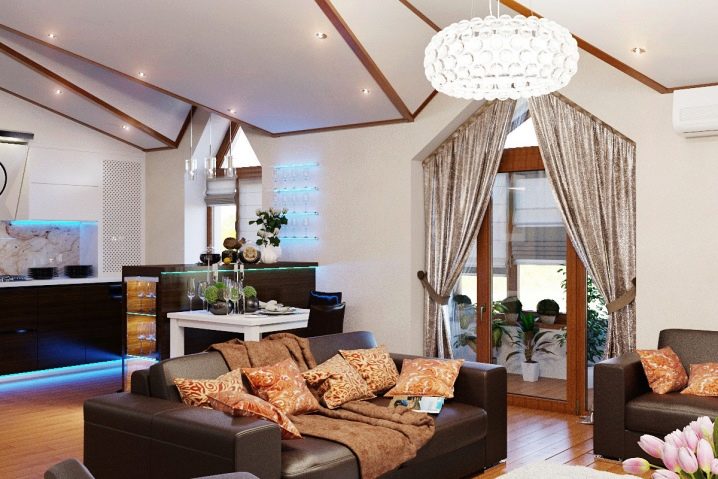 لا يعتبر المطبخ أقل منزلة – غرفة المعيشة الموجودة في العلية. تضيف الغرفة غير القياسية المزيد من الأناقة والرقي إلى غرفة المعيشة في المطبخ. الحجم الصغير ليس عائقا. لا يمكنك تزيين المناطق الداخلية في العلية بأسوأ من الاستوديو في غرفة عادية..
