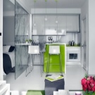 إذا كنت تشك في إمكانيات الأمتار المربعة الخاصة بك ، فاختر نموذجًا زخرفيًا وجماليًا لقسم المطبخ: لن يشغل مساحة كبيرة في مساحتك. من الأهمية بمكان تحديد الموقع الصحيح لوحدة المطبخ ومنطقة تناول الطعام بحيث يكون التصميم الإضافي مناسبًا.