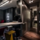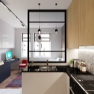 تتيح لك فكرة التصميم إنشاء تصميم داخلي فريد من نوعه لغرفة المعيشة في المطبخ مع قسم – في بعض الأحيان تفاصيل مهمة ولهجة الغرفة. تتمثل الفكرة الأصلية في استخدام هيكل زجاجي بالكاد يمكن ملاحظته في الغرفة – يقع القسم بشكل موازٍ للنافذة ويفصل منطقة الطهي عن منطقة الراحة بأريكة مريحة موجودة فيه.