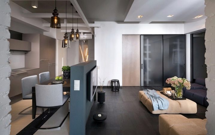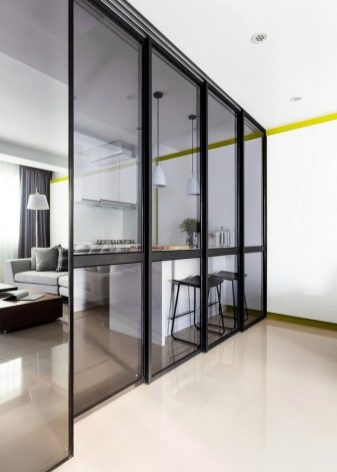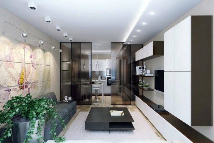 بالإضافة إلى ذلك ، فإن القسم المنزلق وظيفي: فهو يسمح لك بفصل منطقة المطبخ عن غرفة المعيشة ، وهو أمر مهم بشكل خاص عند تحضير الطعام. يتم تثبيت الهيكل الخفيف للقسم بكل بساطة ولا يتطلب تغييرًا شاملاً للغرفة ؛ لإنشائه ببساطة وفقًا لرسم فردي من أي مواد ومجموعاتها ، والتي ستصبح فرصة لإنشاء تصميم داخلي فريد لغرفة المعيشة في المطبخ. من المزايا المهمة لمثل هذا القسم لغرفة المعيشة في المطبخ أنه يمكن إغلاقه أثناء الطهي – لن تدخل الروائح والأبخرة إلى غرفة أخرى ولن تنتشر في جميع أنحاء المنزل..