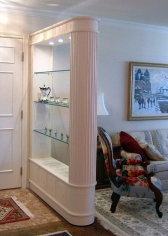 يعد الجدار الزائف مع وحدة الرفوف نموذجًا آخر لقسم وظيفي لمطبخ غرفة المعيشة ، والذي يسمح لك بوضع عناصر الديكور وتنويع الغرفة بتفاصيل مثيرة للاهتمام.