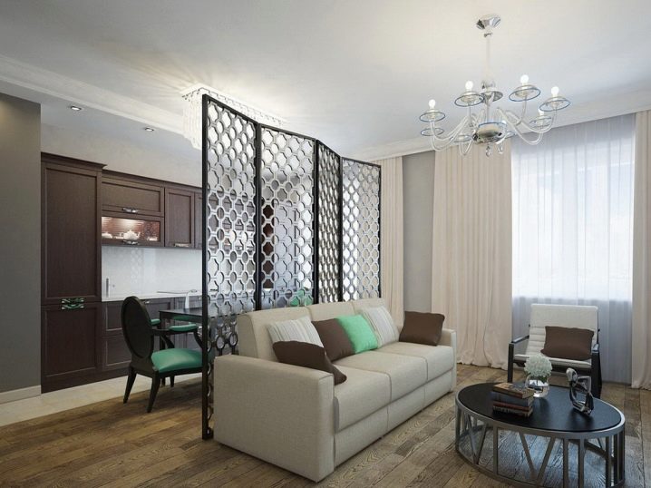تعتبر الشاشة كقسم مثالية لغرفة المعيشة والمطبخ المتواضعة ، حيث من المهم الحفاظ على الجو العام وإضفاء القليل من الحداثة على داخلها. بالنسبة للغرفة الكبيرة جدًا ، قد لا تكون الشاشة مفيدة ؛ ولكن كعنصر زخرفي وجمالي ، فإن هذا النوع من التقسيم مناسب تمامًا.