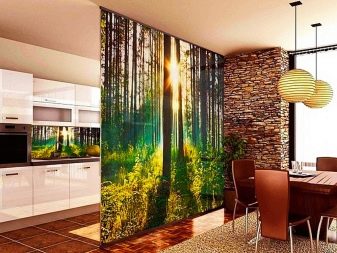 تتميز أقسام المطبخ بميزة مهمة واحدة: فهي تتيح لك تحديد مساحة غرفة المعيشة والمطبخ الفسيحة ، وفصل غرفة واحدة عن الأخرى بشكل مشروط ، مع الحفاظ عليها ككل. تعتبر الأقسام ملائمة أيضًا لأنها في بعض الأحيان لا تشغل مساحة ثمينة في الغرفة ، فهي تسمح لك “باللعب” بالداخل وتصميمه دون المساس بالشقة أو المنزل. تعمل أقسام المطبخ أيضًا كعنصر زخرفي: قد تختلف قطعة الأثاث هذه في اللون عن الظل الرئيسي للغرفة ، وسيكون اختيارًا ممتازًا هو استخدام ورق حائط للصور عليها..