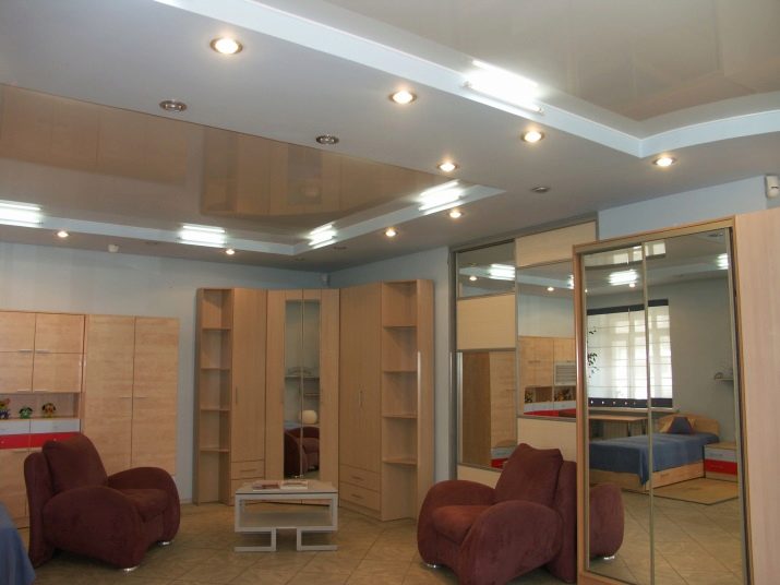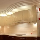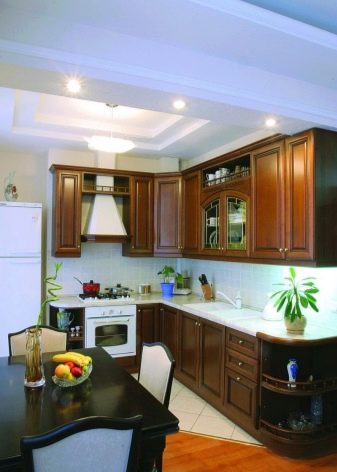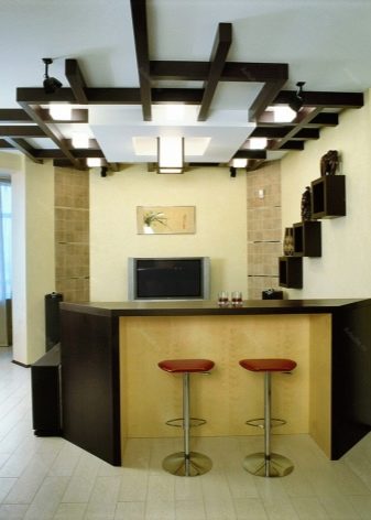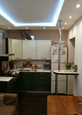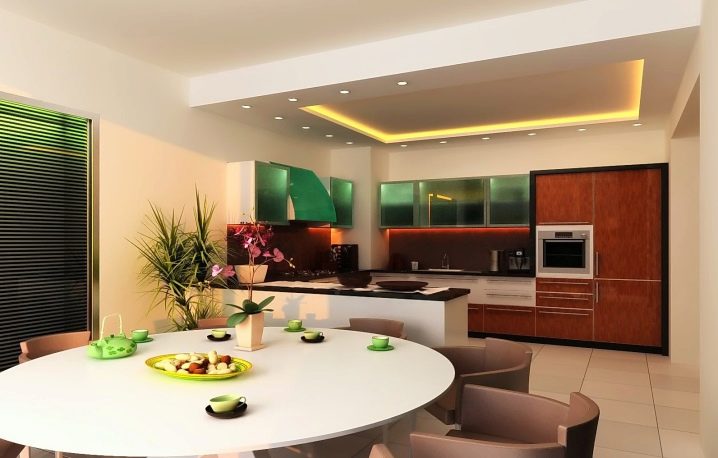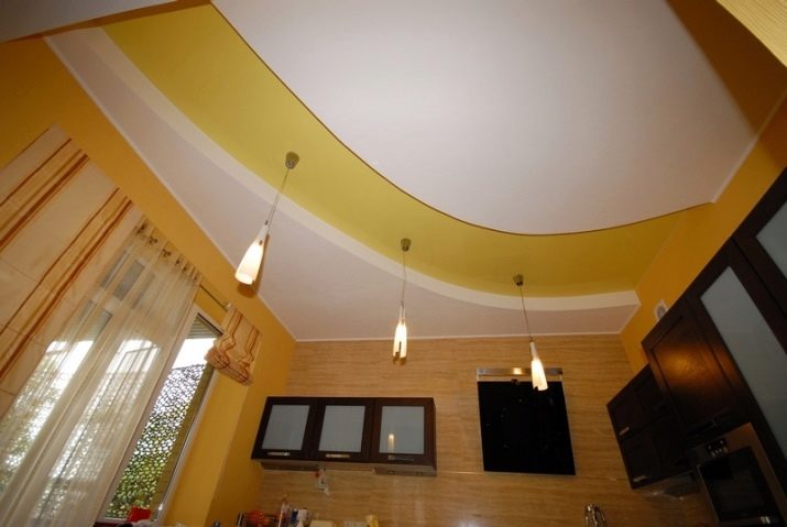 غالبًا ما تكون الأسقف المعلقة في هذه الغرف مصنوعة من مواد مقاومة للرطوبة يمكنها تحمل الرطوبة. هناك العديد من الاتجاهات التي لا تسمح لك فقط بتسوية السطح في المطبخ ، ولكن أيضًا لإنشاء تصميم داخلي فريد. NSفي الوقت نفسه ، من المهم جدًا الانتباه إلى شكل مثل هذا البناء: