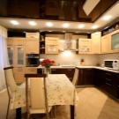 تبدو الأسقف الممتدة ذات المستويين جميلة بشكل خاص في المطبخ وغرفة المعيشة.. لتثبيتها ، يمكن وضع هيكل من اللوح الجصي في الوسط ، مما يخلق مساحة خالية ، وحول المحيط بالكامل بالكامل ، مع تزيين المناطق الفردية بإدخالات خاصة. بالإضافة إلى ذلك ، يتيح لك التصميم ذو المستويين إبراز حدود الغرفة دون استخدام الحواجز والشاشات..