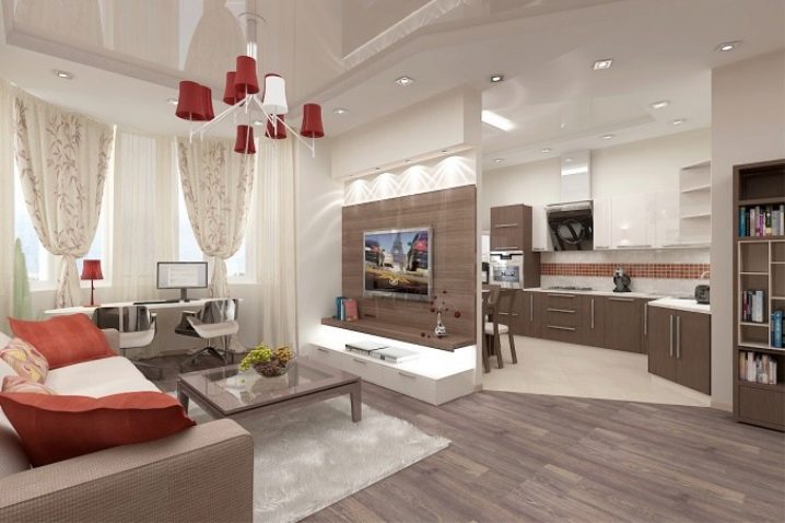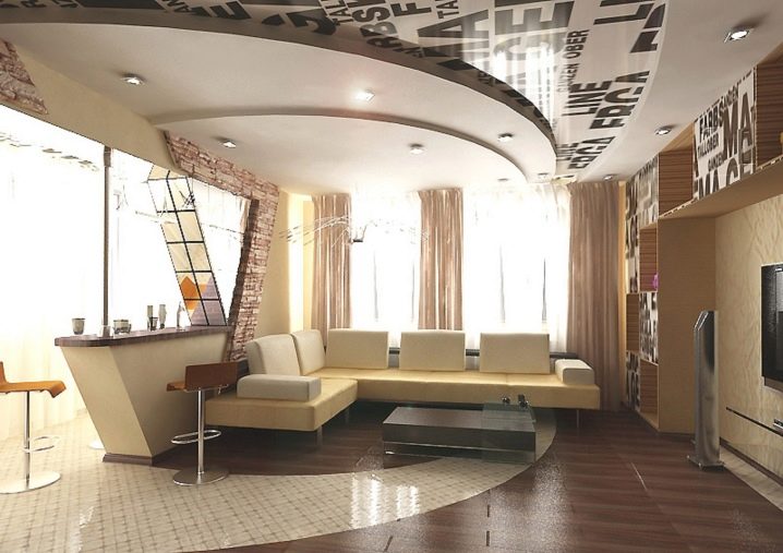 تبدو التصاميم الحديثة للأسقف في المطابخ وغرف المعيشة خاصة. للقيام بذلك ، يجمع المصممون بين الألوان المختلفة ، مما يمنح السحر والجمال الداخلي ، كما أن تركيب الإضاءة في سقوف متوترة من مستويين يجعل الإضاءة أنيقة ومتعددة الوظائف..
