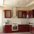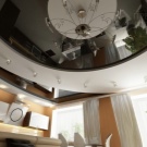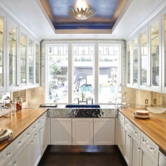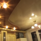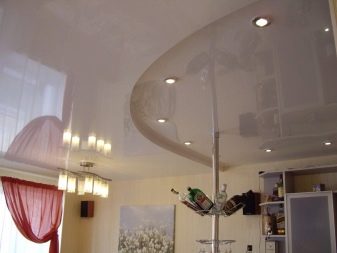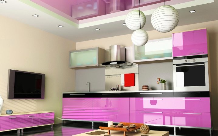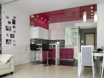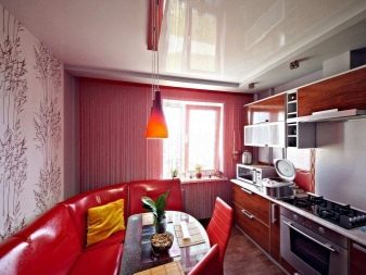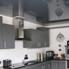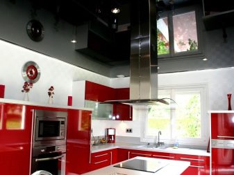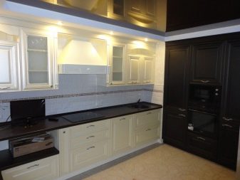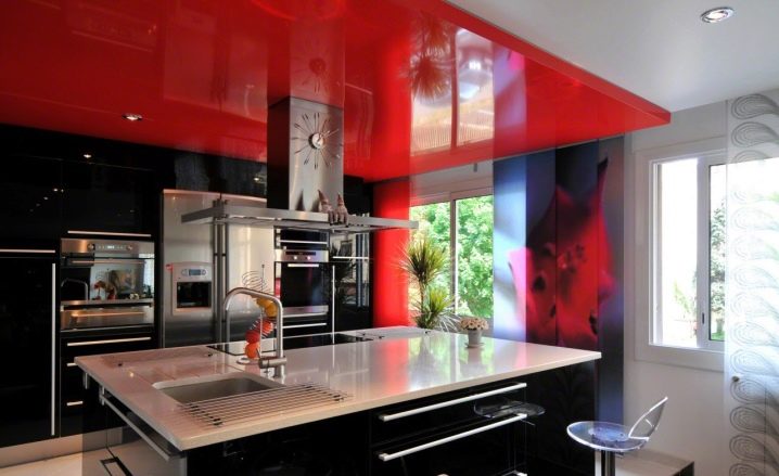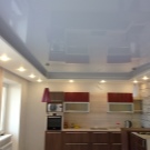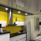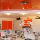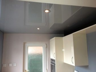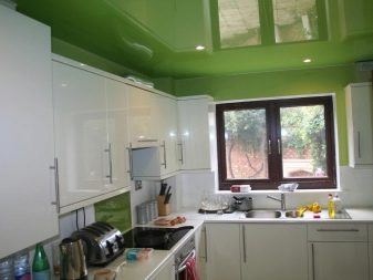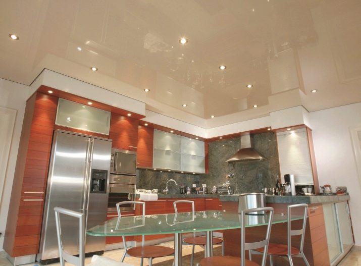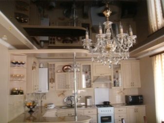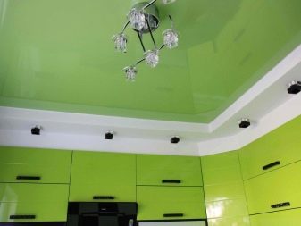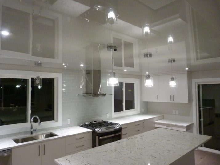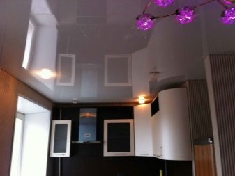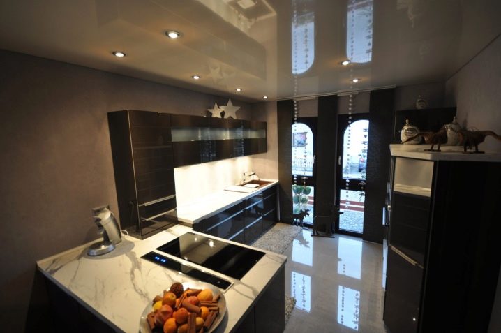 ينصح المصممون باستخدام فيلم الفينيل بنسيج لامع في الغرف الصغيرة والمطابخ التي تصل مساحتها إلى 7 أمتار مربعة. م يعكس سطح المرآة لهذه المادة ما يصل إلى 85٪ من الضوء. سيساعد هذا على توسيع المساحة المرئية بصريًا ، وزيادة المساحة. من خلال اختيار الألوان الفاتحة للأسقف ، فإنك تخاطر أيضًا بجعل المطبخ أكثر اتساعًا..