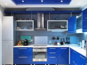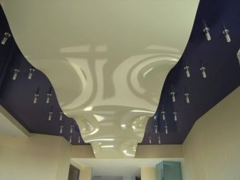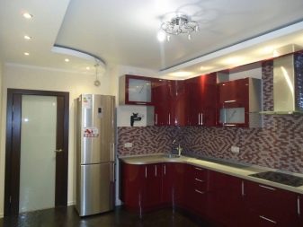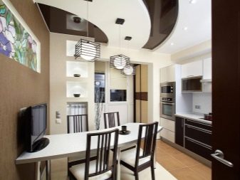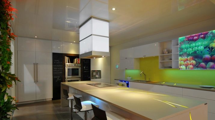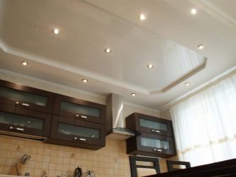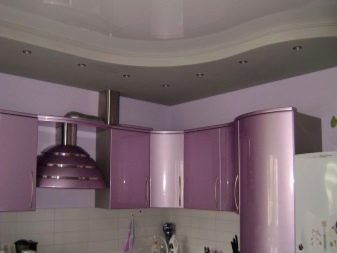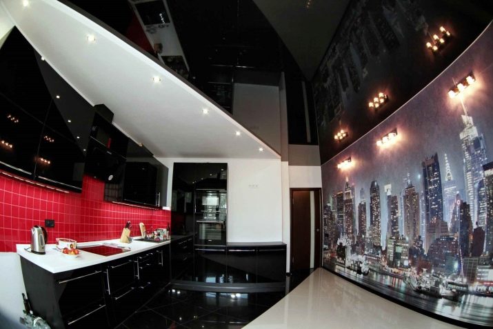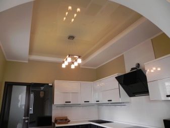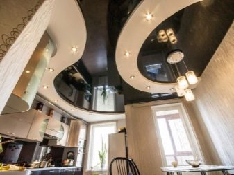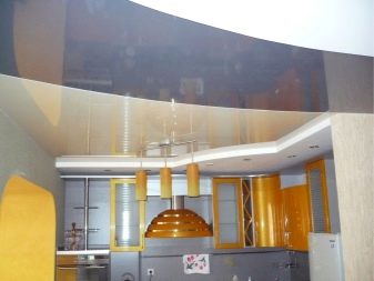 بالنسبة للمطابخ الفسيحة ذات الارتفاع الكبير في السقف ، فإن القصور الريفية ، سيكون الهيكل المعقد المكون من مستويين أو متعدد المستويات تصميمًا مثيرًا للاهتمام. من خلال الجمع بين الألوان والأنسجة والإضاءة بكفاءة ، يمكنك تحقيق تأثير مذهل ، أو إعداد جو رومانسي أو فاتح أو صالة في المنزل. في كثير من الأحيان ، يحددون التراكيب في المطبخ على شكل سقف مرتفع ، وسماء مرصعة بالنجوم ، وفراغ كوني. التعامل مع الملمس ، وإيلاء اهتمام خاص للتأثير الساتان واللمعان والمعدني. وباستخدام التكنولوجيا الحديثة لطباعة الصور ، يمكنك تطبيق أي صورة وطباعتها وتزيينها على الفيلم وضبط نغمة التصميم الداخلي بالكامل.