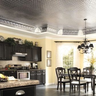 إنه دائم ، ممتاز للاحتفاظ بالشكل ، مقاوم للماء. يمكن شراؤها بتكلفة بسيطة ، وإضافة نكهة إلى داخل المطبخ ، ومظهر جذاب. يقدم سوق مواد البناء الحديث والكثير من أفكار التصميم نماذج سقف متعددة المستويات ذات تأثيرات غير عادية..