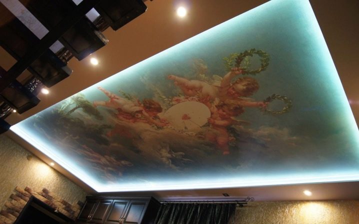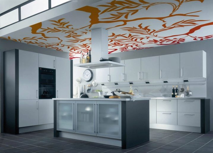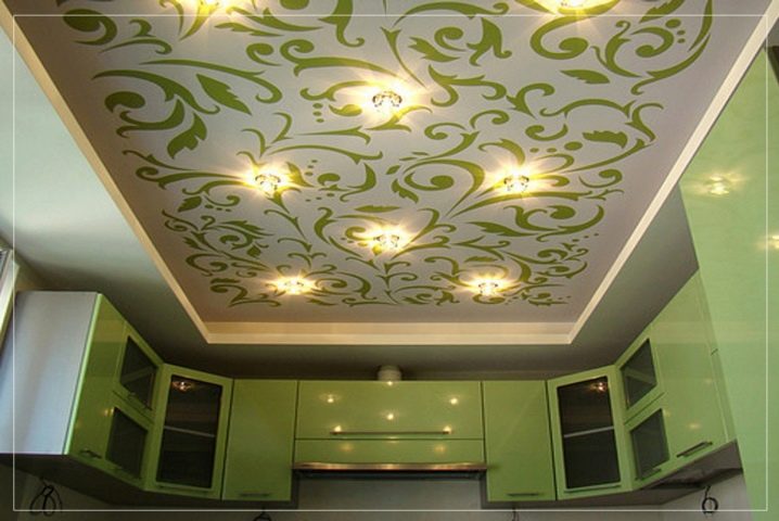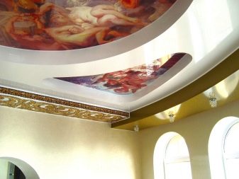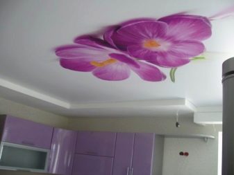 سيبدو سطح السقف مع اللوحات المطبقة عليه أنيقًا. يختار العميل السمة والمطبوعات وتقنية الرسم بشكل مستقل: طباعة الصور ، الأكريليك أو الرسم بالألوان المائية ، الفسيفساء ، إلخ. لا تزال الحياة ، أو تركيبات الفاكهة ، أو السماء المرصعة بالنجوم ، أو الملائكة المرسومة أو قاع البحر مناسبة للمطبخ. إذا كنت تبحث عن طباعة فنية ، فأنت بحاجة إلى استخدام طابعة كبيرة الحجم بحبر دائم.