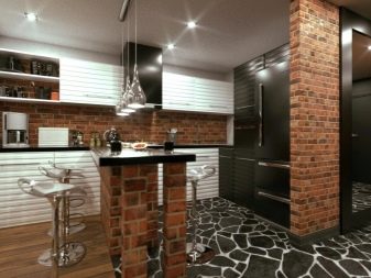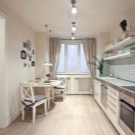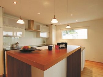 من المهم جدًا هنا التفكير في الإضاءة عالية الجودة لكل منطقة في المطبخ. يمكن أن يكون الضوء المنتشر الخافت قليلاً في منطقة الصالة فقط. يجب أن تضاء بقية الأماكن بأكبر قدر ممكن من السطوع ، بطريقة أصلية. للقيام بذلك ، استخدم الهياكل المعلقة أو مصابيح الهالوجين أو شرائط أو مصابيح LED..