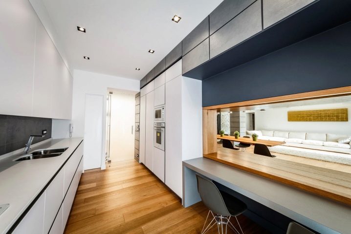 لخلق جو خاص في المطبخ وفي الشقة بشكل عام ، راجع الهياكل متعددة المستويات ذات الأسطح المنحنية ، وكذلك العناصر ثلاثية الأبعاد..