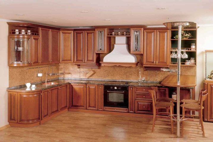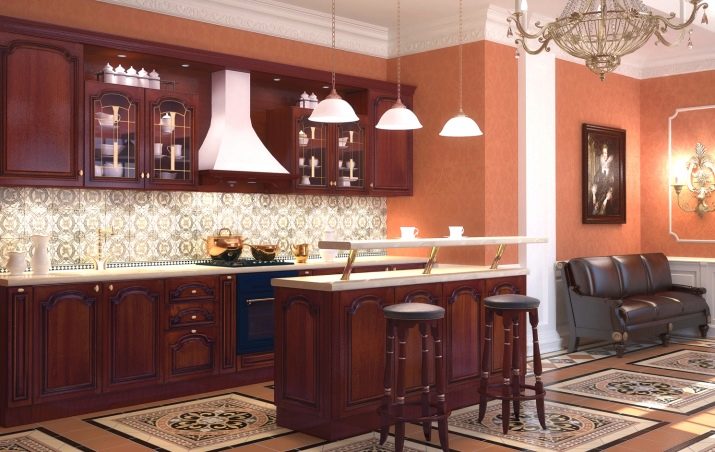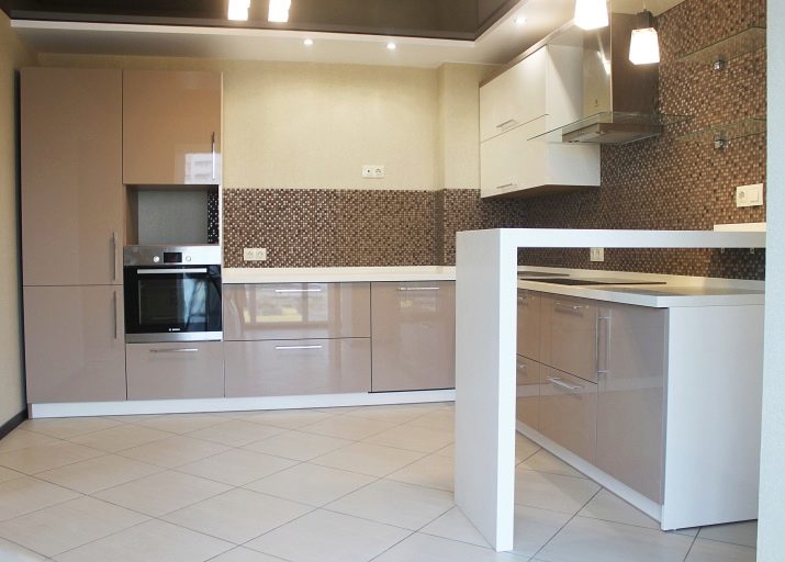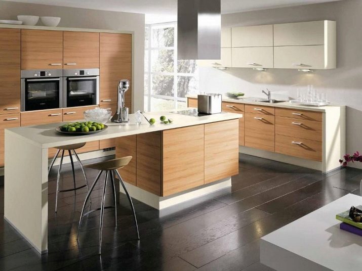 تعتبر أسطح العمل ذات الألوان الفاتحة اللامعة في سماعة الرأس خلفية رائعة للعداد ، على سبيل المثال ، من الخشب الداكن. لتزيين البار بطريقة مثيرة للاهتمام ، كقاعدة عامة ، يستخدمون مادتين: الخشب وحجر كوريان الاصطناعي الأنيق. الخشب كلاسيكي من هذا النوع ، وكوريان لمؤيدي أسلوب المطبخ "تقنية عالية" وغيرها من الحلول المبتكرة.
