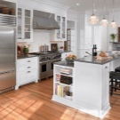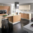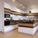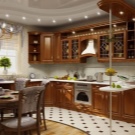 تصميم من نوع الجزيرة مناسب لمثل هذا المطبخ الواسع إلى حد ما. يحتوي هذا الطراز على العديد من الوظائف الإضافية والأرفف والأدراج وأحيانًا مغسلة مع موقد. خلف هذا العداد ، من الملائم تناول وجبة خفيفة ومن الملائم تحضير أطباق من أي تعقيد..