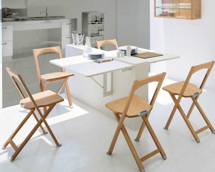 عندما يتم تجميع مثل هذا الرف ، فإنه يشغل مساحة صغيرة جدًا ، وإذا تم توسيعه بالكامل ، فإنه يصبح طائرة طعام كاملة ، وليس أسوأ من طاولة كلاسيكية.