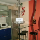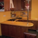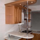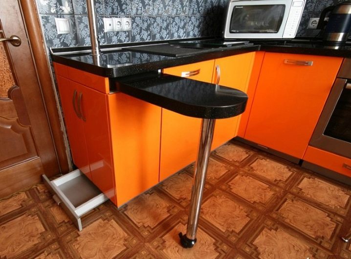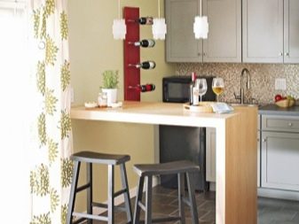 بالنسبة للمطبخ الذي يحتوي على مثل هذه اللقطات ، بدلاً من الطاولة ، سيكون من الضروري الاستغناء عن العارضة ، والتي لن تكون بنفس عرض طاولة المطبخ العادية ، ولكنها أوسع قليلاً من الأبعاد القياسية لعداد العارضة. يمكن صنع هذا الأثاث حسب الطلب أو صنعه بنفسك. ستكون طاولة البار في مطبخ صغير طاولة طعام ممتازة..