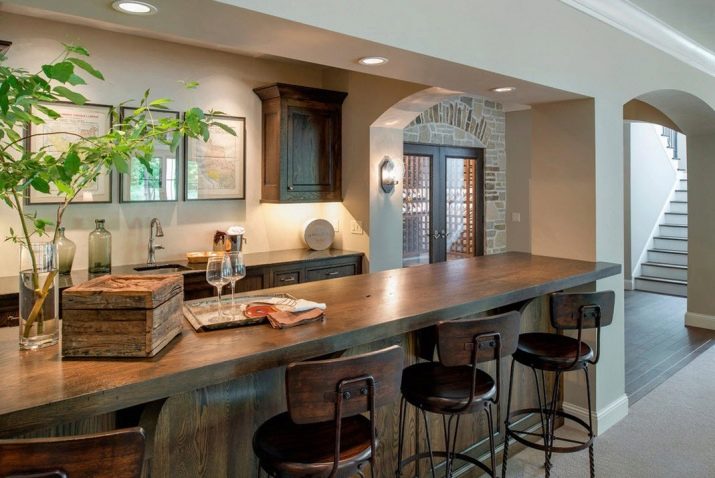 بعد صنع الشريط ، تحتاج إلى تصميمه. من الضروري شراء مقاعد عالية ، والتي بدونها لا يمكننا تخيل طاولة بار. بالإضافة إلى ذلك ، تحتاج إلى شراء واقيات قضبان خاصة للنظارات والنظارات ، وجميع أنواع الملحقات مثل اللوحات والأطباق وألواح الحائط – بدون كل هذا لن تحصل على “حاشية بار” حقيقية.