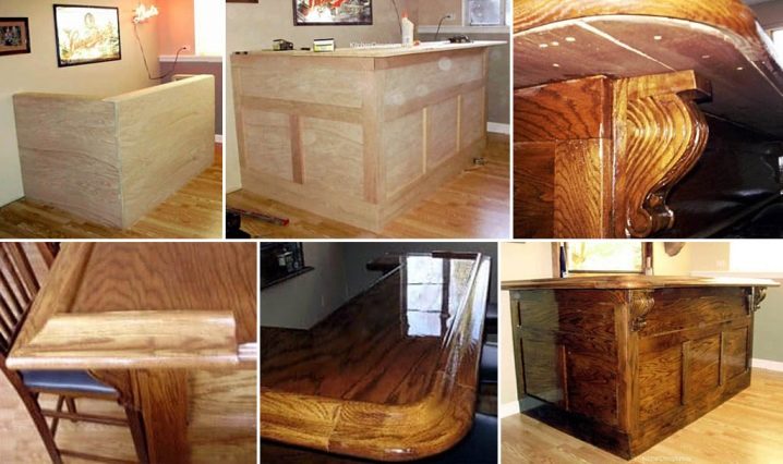 منضدة البار الخشبية مناسبة لغرفة مزينة على الطراز العتيق ، على الطراز الريفي والأرت ديكو والطراز الريفي. عدادات المطبخ المصنوعة من الخشب ، والتي تم تقادمها بشكل خاص ، مع ثقب دودي ، لها مظهر غير عادي ومثير للاهتمام للغاية. تصميم هذه التصميمات الأصلية قادر على مفاجأة عشاق الأثاث بأسلوب الدور العلوي ، بعيدًا عن الأشكال الكلاسيكية..