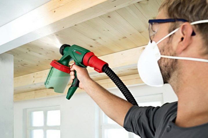 يعد طلاء السقف بضاغط كهربائي ومسدس رش أمرًا جيدًا لأن الطلاء موزع بالتساوي على السطح ، ويتم حفظ المادة نفسها قدر الإمكان. العيب في المعدات باهظة الثمن (يمكن استئجارها) ، وصعوبة الحفاظ على الوحدة ، وارتفاع استهلاك الطاقة والضوضاء أثناء العمل.