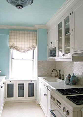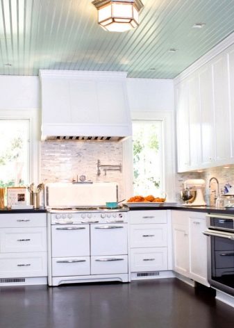 بالنسبة للمطبخ يجب اختيار سقف يتناسب مع لون باقي الأجزاء الداخلية والأثاث. إذا كانت طريقة التشطيب هي الطلاء ، فإن الخيار العام هو أكريليك أبيض أو ألوان فاتحة جدًا. إنها ، مثل المتناقضة ، مناسبة لمجموعة المطبخ الأسود ونفس الأجهزة المنزلية. لإنشاء صورة مدمجة واحدة للجدران والسقف ، يمكنك استخدام نفس الطلاء – غير لامع أو لامع.