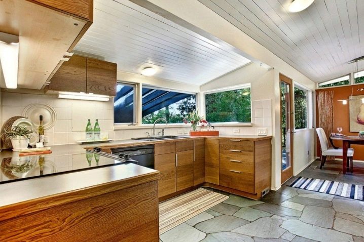 يتم تثبيت الأسقف الشرائحية للمطبخ على إطار مستطيل على مستوى أفقي باستخدام شرائح من الألومنيوم مغطاة بطبقات ملونة واقية. يبلغ أطوالها 3 و 4 أمتار ، مما يسمح لها بالتناسب تمامًا مع عرض الغرفة القياسية. يمكن أن تكون الألوان ، حسب السطح ، لامعة أو غير لامعة أو رتيبة أو ذات قوام مختلف. من الممكن اختيار أي لون للداخلية الموجودة. مزايا سقوف النهر في المطبخ: