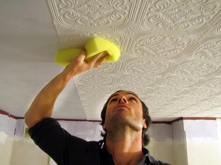 يتم تنظيف سطح خلفية السقف بنفس الطريقة المستخدمة في التبييض ، يمكنك استخدام طبقة رقيقة من المعجون الخام السائل. يوصي الكثير من الناس باستخدام نفس غراء ورق الحائط كطبقة أولية. قبل اللصق ، من الضروري تحضير مساحة خالية من الأرضية للنشر بالغراء ، لحماية الأثاث من البقع. في هذه العملية ، يتم تطبيق البكرات المعلمة والمقطوعة على السقف وتمهيدها. أثناء العمل وبعده ، من غير المرغوب فيه طهي أي شيء في المطبخ أو تهويته لمدة 6-8 ساعات..