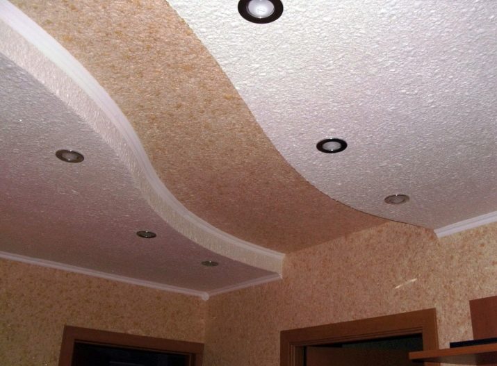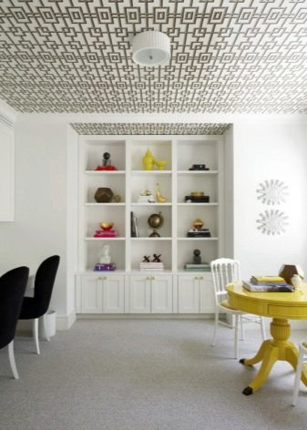 لإنهاء السقف في المطبخ ، من الضروري اختيار ورق جدران قابل للغسل مقاوم للرطوبة. بالنسبة لجدران المطبخ ، غالبًا ما يتم استخدام هذا النوع من الطلاء ، لكن طلاء السقف له خصائصه الخاصة: في الأعلى يتراكم الهواء الساخن ، ويذهب كل السخام إلى هناك. لذلك ، بمرور الوقت ، يمكن أن تصبح خلفية الشاشة متسخة أو تبدأ في التأخر خلف السطح. من الأفضل استخدام مظهر الفينيل ، حتى في حالة ظهور بقع ، يمكن دهنها وتنظيفها بقطعة قماش مبللة من الأوساخ.