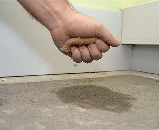 بعد إزالة غطاء أرضية المطبخ القديم ، يبقى فقط الخرسانة العارية. في أغلب الأحيان ، يحتوي هذا السطح على تشققات وعيوب صغيرة يجب إزالتها. من الأفضل استخدام كمية صغيرة من الأسمنت لهذه العملية. يجب تطبيق المحلول على الأجزاء المشوهة ، ثم الانتظار حتى يجف. تأكد من الانتباه إلى العيوب والشقوق في منطقة موقع الألواح..