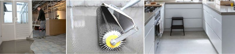 يجب سكب الخليط الناتج على قاعدة معدة. الطبقة الأولى مستوية بعناية باستخدام مجرفة طويلة. في نفس المرحلة ، يتم إنشاء سمك السطح المطلوب. الشرط الأساسي هو القضاء على فقاعات الهواء ، لأن هذا في المرحلة النهائية سيؤثر سلبًا على جودة الأرضية في المطبخ. سوف تساعد أسطوانة إبرة خاصة في هذا الأمر..