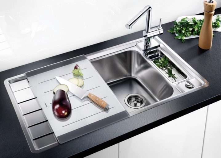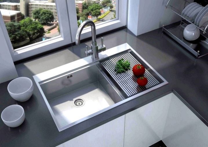 مغاسل الغسيل متوافقة أيضًا مع مساحة العمل. الجناح عبارة عن طائرة معدنية يمكن ، حسب تقديرك ، استخدامها لتجفيف الأطباق أو لأغراض أخرى. تساعد الأجنحة في حماية سطح الطاولة ، وهو أمر جيد بشكل خاص إذا كان مصنوعًا من الخشب.
