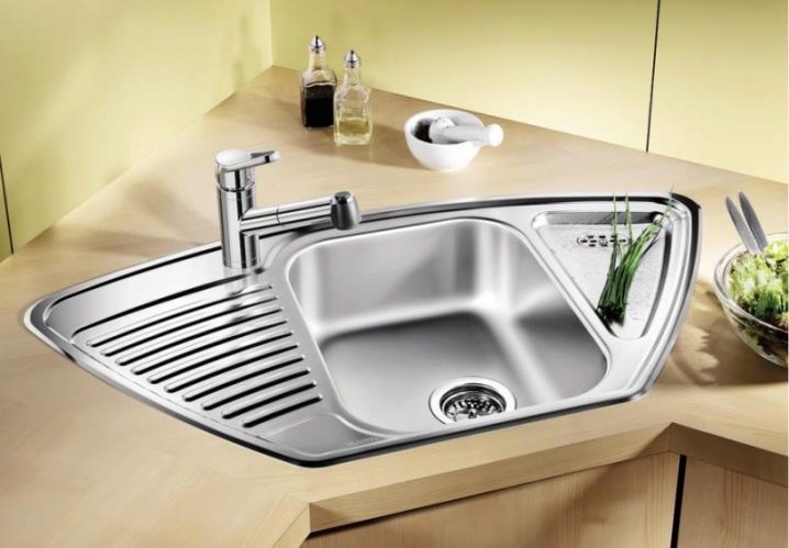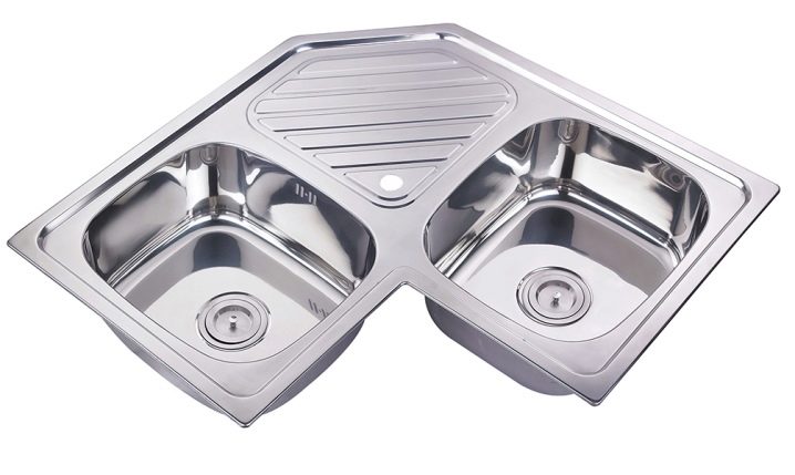 لمجموعات الزاوية ، يجب عليك اختيار الحوض المناسب. وتتكون من وعاءين ضيقين مستطيلين وضعيهما بزاوية مع بعضهما البعض. يوجد بينهما عادة إما مكان لتجفيف الأطباق ، أو منطقة عمل إضافية لتقطيع اللحوم أو تقطيع الخضار المغسولة حديثًا..