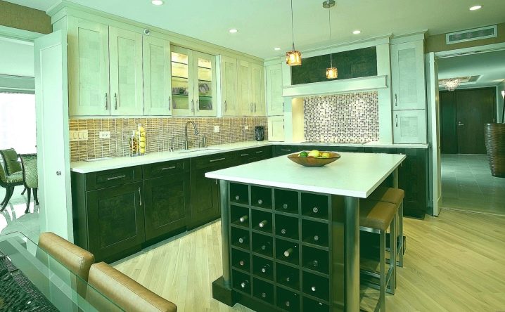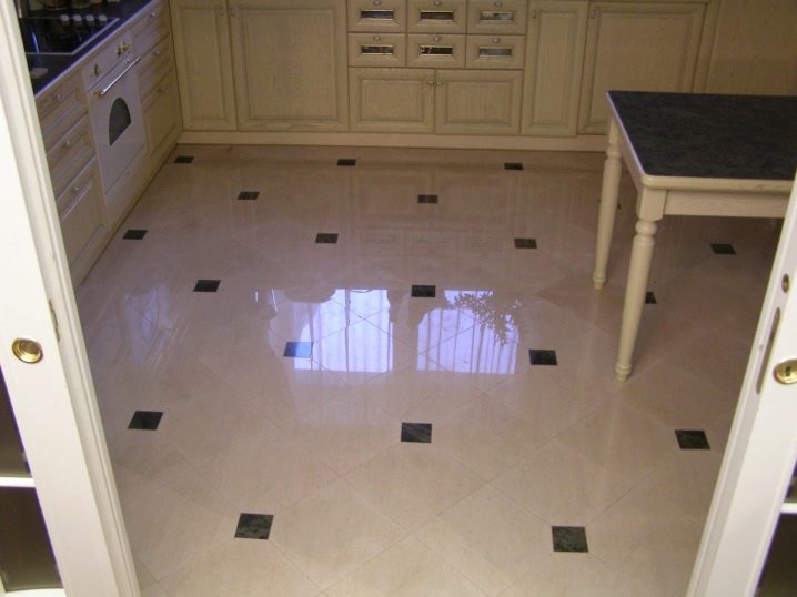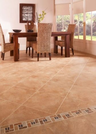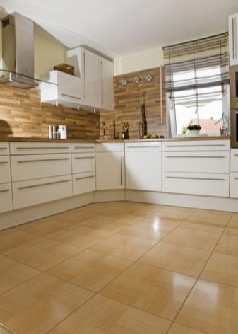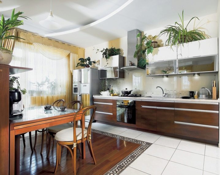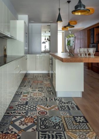 اليوم ، يستخدم المصممون بنشاط خيارات الأرضيات المختلفة لإضافة أسلوب حديث إلى الداخل. تسمح مجموعة متنوعة من الألوان والقوام ، على سبيل المثال ، بتوزيع مساحة مطبخ كبير ، وتسليط الضوء بشكل مشروط على مناطق الطهي وتناول الطعام ، ومنطقة الترفيه.