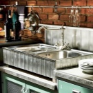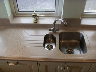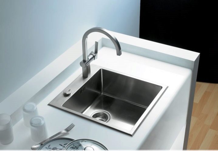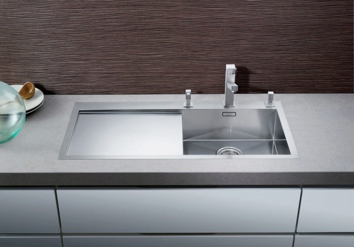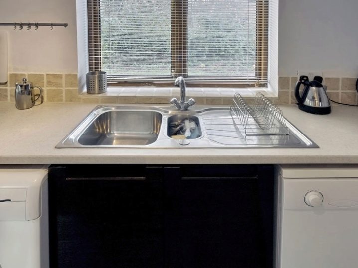 خيار رائع عندما تشتري مطبخًا رخيصًا من الدرجة الاقتصادية ، يتكون من وحدات جاهزة ، قياسية. لكن في هذه الحالة ، يجب غسل الأطباق بعناية شديدة حتى لا يتدفق الماء إلى الشقوق بين الخزانات. إذا لم يتم اتباع ذلك ، يمكن للأثاث ببساطة أن ينتفخ ويفقد كل جاذبيته..