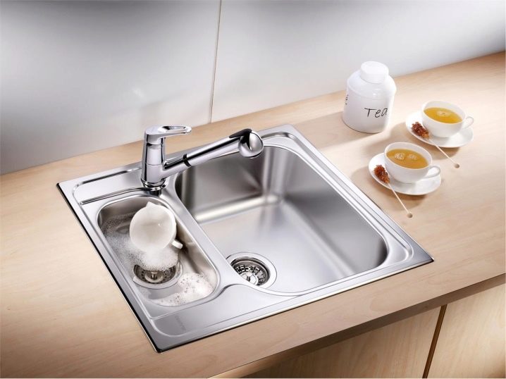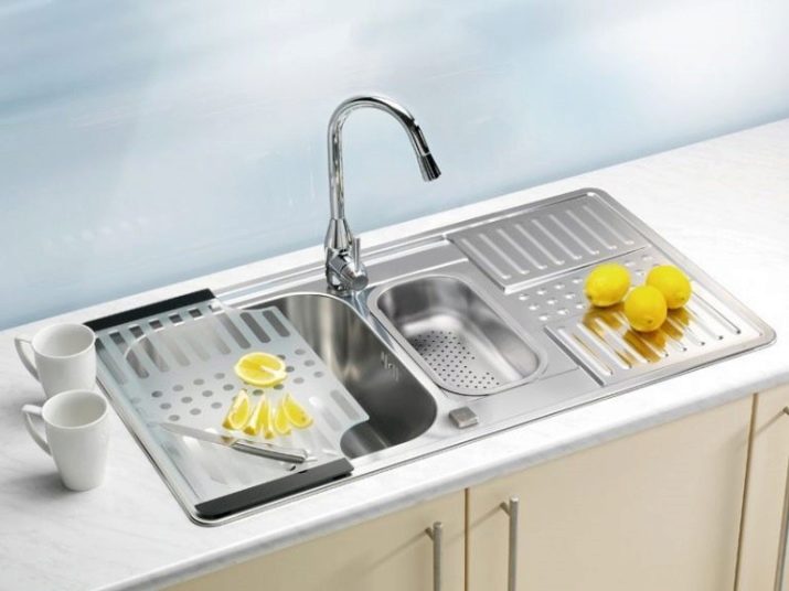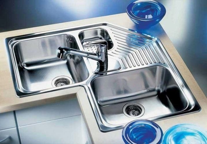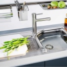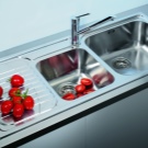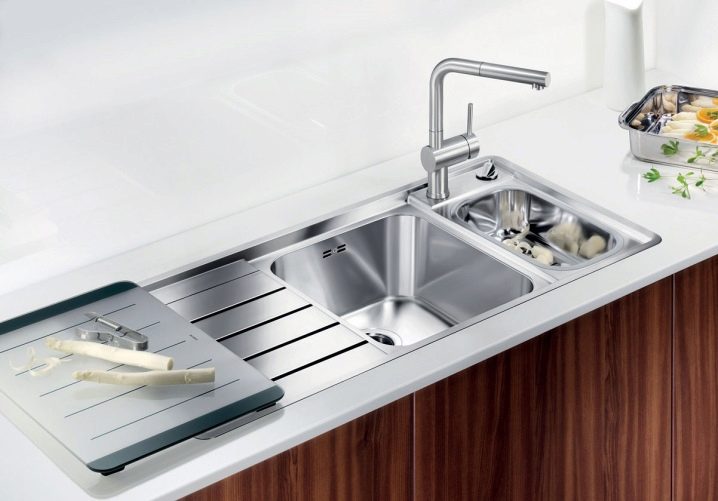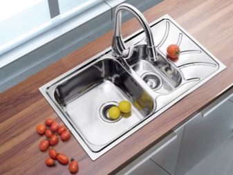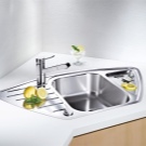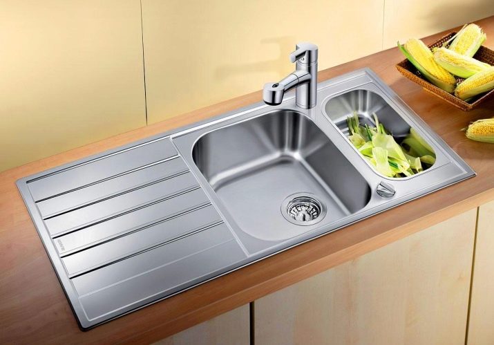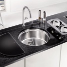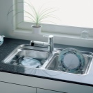 إذا لم يكن هناك مساحة كافية في المطبخ ، فيمكن تجهيزه بحوض مع أوعية صغيرة وبدون جناح إضافي. سيكون الحل الأمثل للجزء الداخلي من مطبخ صغير هو حوض من قسمين ، وبفضل ذلك سيتم حفظ سطح العمل في المطبخ بشكل كبير وسيتم استخدام المفصل الفارغ عادةً في زاوية سطح العمل..