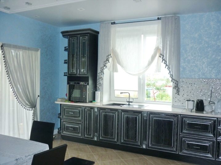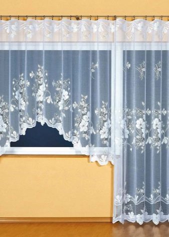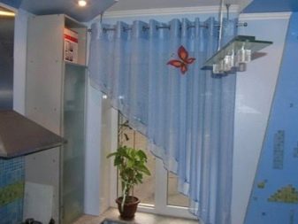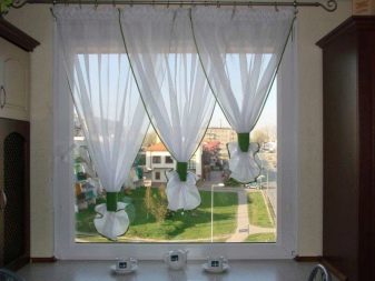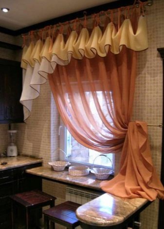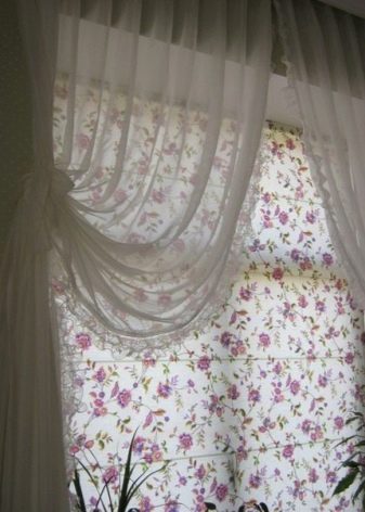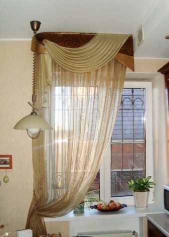 - ستائر مطبخ شفافة بالكامل. يتكون التصميم الأصلي في الصورة من رباط ستائر مثير للاهتمام..