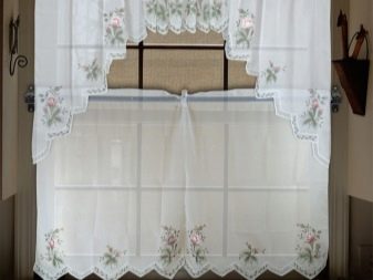 - ستائر شفافة بأزهار مطرزة مزينة مثل الستائر الرومانية. تُظهر الصورة بوضوح كيف أن الستائر لا تغلق النافذة كثيرًا ، ولكنها تكمل أسلوب المطبخ ، في انسجام مع لون الجدران والأثاث..