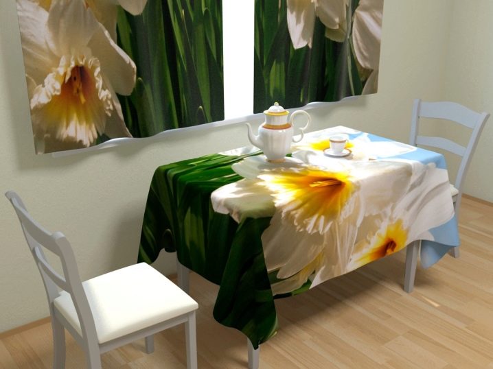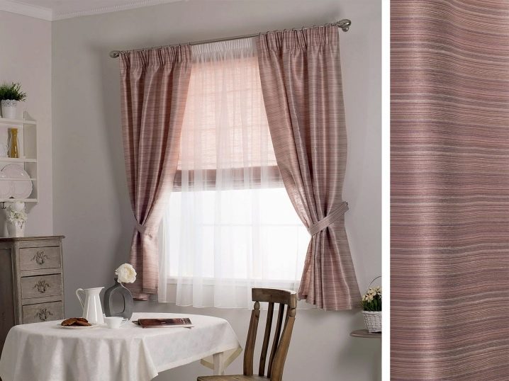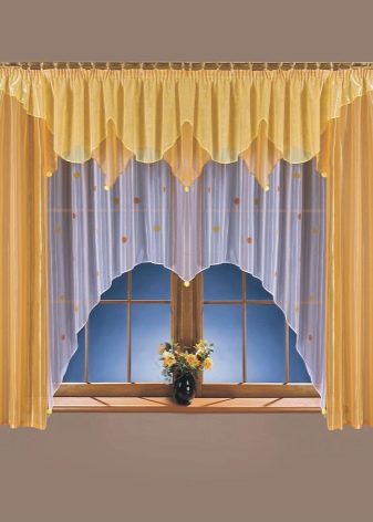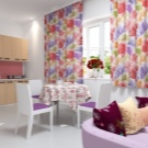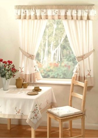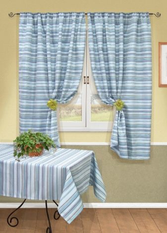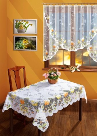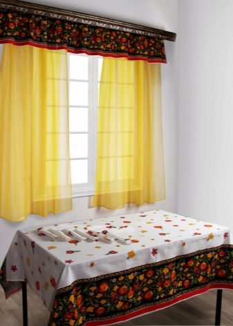 أبسط خيار هو مجموعة من الستائر مع مفرش المائدة. يمكن أن يكون مفرش المائدة والستائر متماثلين تمامًا. هذا الخيار مناسب تمامًا لمطبخ صغير ومتواضع لأنه يبدو ريفي في حد ذاته. لكن من السهل الاختيار ، وهنا من المستحيل ارتكاب خطأ..