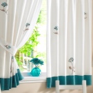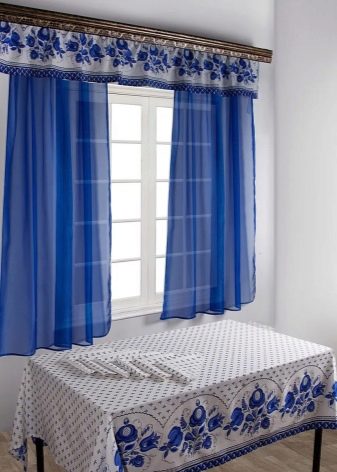 هناك خيار أكثر تعقيدًا قليلاً وهو الألوان والأنماط المتشابهة. على سبيل المثال ، الستائر بلون أزرق عادي ، ومفرش أبيض بنمط أزرق ، ولامبريكين قصير لتتناسب مع مفرش المائدة.
