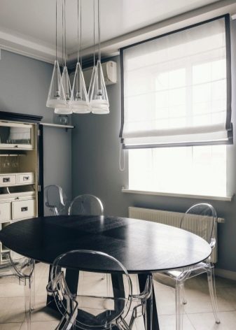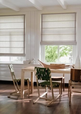 إذا كان المطبخ مزينًا بأسلوب بسيط ، فإن الستارة الرومانية الشفافة وغير المرئية تقريبًا تبدو أصلية..