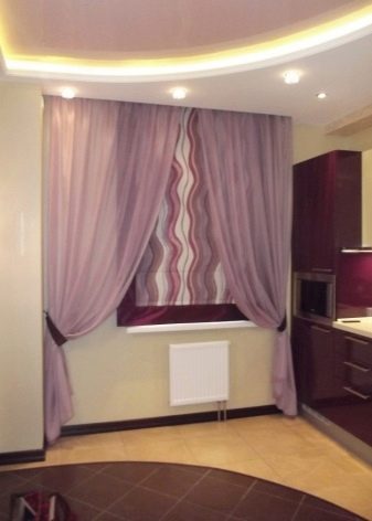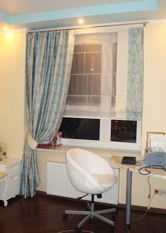 مقترحات جديدة من المصممين – مزيج من ستارة عادية وستارة رومانية. لذلك ، يوجد على نصف النافذة ستارة طويلة كلاسيكية ، وفي النصف الآخر ستارة رومانية عملية ، مصنوعة من نفس القماش أو القماش المطابق. يُنشئ عدم تناسق أصلي يلفت الانتباه إلى نافذتك.