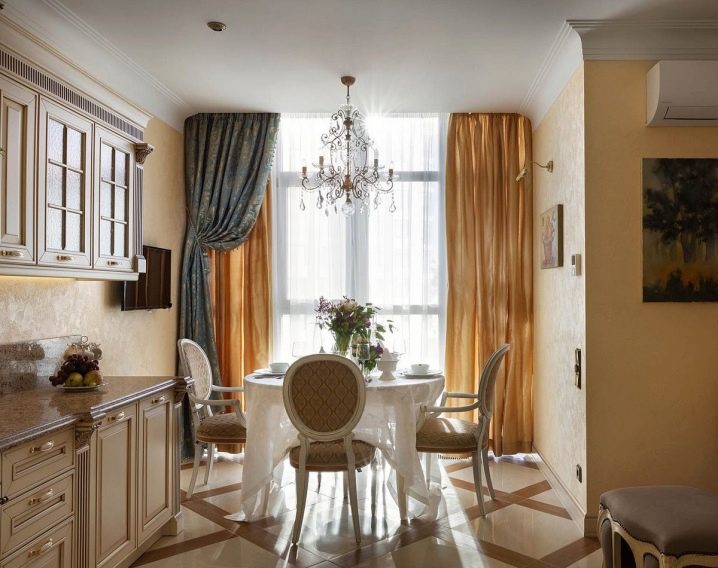 ستائر كلاسيكية مصنوعة من أقمشة ثقيلة أنيقة ، مع الكثير من الأقمشة ، وأقمشة لامبريكين رائعة ، وتركيبات باهظة الثمن مناسبة للغرف الكبيرة حيث يتم الجمع بين المطبخ وغرفة الطعام.