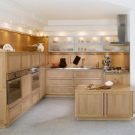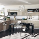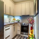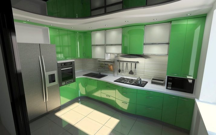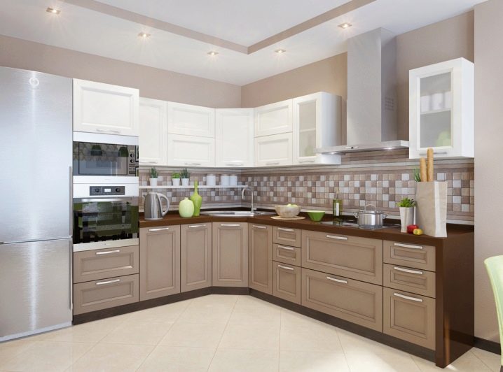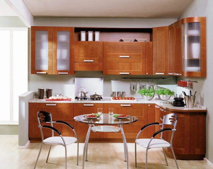 يختلف الوضع إلى حد ما مع خزائن الحائط الزاوية. عادة ما يكون عمق هذه الخزانات أكبر من عمق الخزانات البسيطة. لذلك ، من أجل راحة استخدامك ، يوصي الخبراء بوضعه على ارتفاع لا يقل عن 60 سم ، ومن المعقول للغاية محاذاة المطبخ بأكمله على هذا الارتفاع..