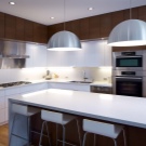 إذا كنت لا تخطط لوضع العديد من الأجهزة على سطح المطبخ ولا تستخدم الأجهزة التي تنبعث منها البخار أثناء العمل ، فيمكنك بسهولة تعليق الخزانات على ارتفاع أدنى من سطح العمل. سيمكنك ذلك من استخدام الرفوف العلوية بأقصى قدر من الراحة. يرجى ملاحظة أنه في هذه الصورة يبلغ طول الشخص 180-190 سم ، ويتم تعديل الطاولة السفلية وفقًا لذلك.