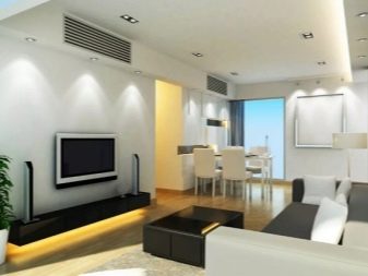 بالنسبة للشقق ذات المساحة الكبيرة ، سيكون مكيف الهواء خيارًا جيدًا. عادة ، يتم تركيب الأنابيب لمثل هذا الجهاز في الفراغ بين الأسقف المعلقة والرئيسية. سيخفي هذا النهج عيوب النظام ويوفر المساحة ، لكن هذه المتعة باهظة الثمن..