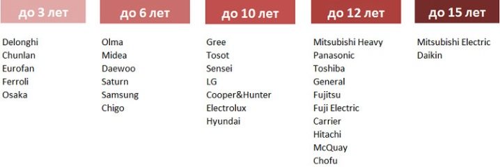 يتراوح العمر الافتراضي للمعدات المتميزة من 12 إلى 15 عامًا.. ومع ذلك ، يتم تحقيق هذا المؤشر بشرط التثبيت الصحيح والتشغيل الصحيح والصيانة في الوقت المناسب. معظم هذه الأجهزة محمية من سوء الاستخدام. على سبيل المثال ، يمكن أن يشتمل مكيف الهواء على حماية ضد الحمل الزائد ، بالإضافة إلى عناصر لتشخيص حالة الجهاز. تتيح لك هذه الآليات الإضافية إيقاف تشغيل الجهاز في الوقت المناسب في حالة ظهور موقف غير طبيعي..