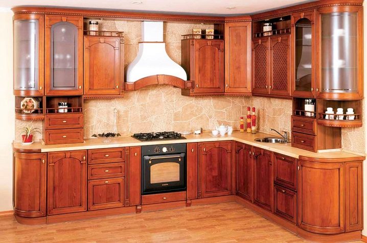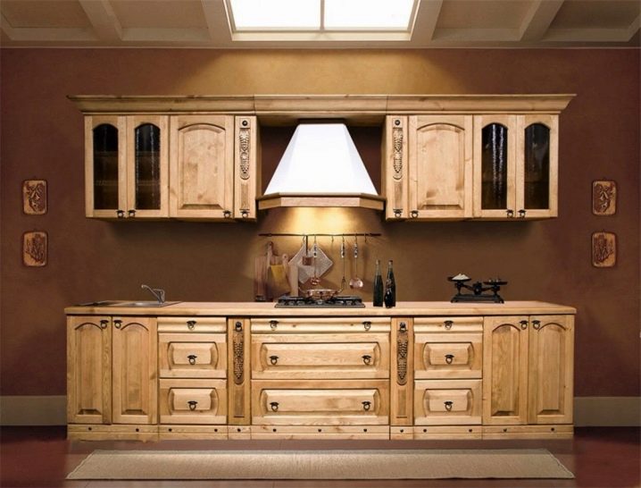 تتميز أنظمة المطبخ المصنوعة من الخشب الطبيعي بخصائصها الخاصة ، والتي تشمل الصفات الإيجابية والسلبية. لا يخفى على أحد أن الأثاث الخشبي هو الخيار الأكثر صداقة للبيئة ، فهو يتميز برائحة الخشب الفريدة ومظهره الجذاب. مع الرعاية المناسبة ، يمكن أن تعمل سماعات الرأس الخشبية الصلبة لسنوات عديدة وتكون موروثة.