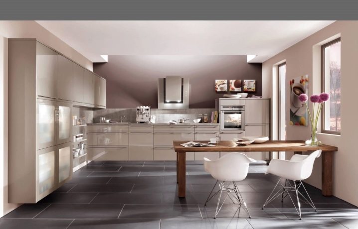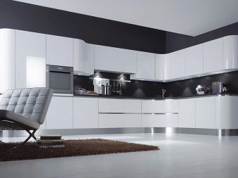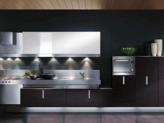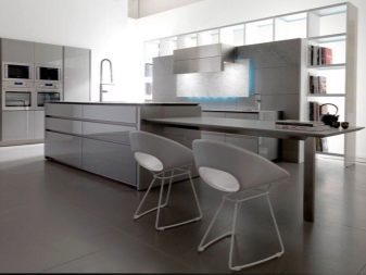 إذا كان أسلوبك المفضل عالي التقنية ، وترغب في إعادة إنشاء تصميم داخلي مماثل في مطبخك ، فإن الأثاث المعدني المعياري مثالي لك. تتميز الظلال المعدنية الباردة بخصائص هذا النمط ، لذلك غالبًا ما يكون لسماعة الرأس المصنوعة من هذه المادة لون رمادي طبيعي. عند اختيار المطبخ ، سيُعرض عليك خياران: واجهات غير لامعة ولامعة.