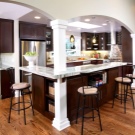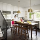 تخطيط شبه الجزيرة – يختلف عن الإصدار السابق من خلال وجود طاولة بار أو طاولة تقديم. يكمل هذا العنصر منطقة العمل بشكل منطقي ويقسم مساحة المطبخ إلى قسمين: للطهي (العمل) وللأكل (تناول الطعام).