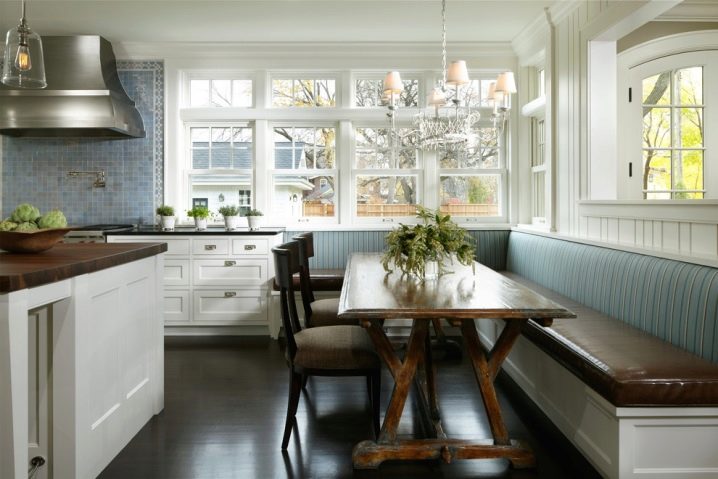بدلاً من الكراسي ، يمكن استخدام زاوية المطبخ ، والتي ستكون بديلاً رائعًا لهم. إنها عملية للغاية ، حيث توجد عادةً أقسام إضافية أسفل المقاعد حيث يمكنك تخزين مجموعة متنوعة من الملحقات..