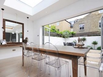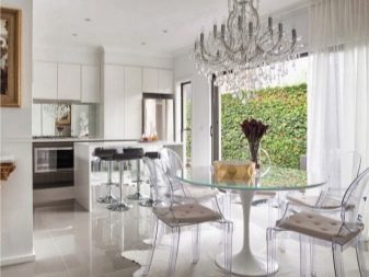 تبدو الكراسي الشفافة غير عادية. إنهم يزينون المطبخ ، ويكبرون المساحة بصريًا ، ويعكسون الضوء الاصطناعي أو ضوء النهار جيدًا. بفضل هذا ، يبدو المطبخ أنظف وأخف وزناً وأكثر راحة. تبدو هذه التصميمات جيدة في مطبخ صغير وغرفة طعام كبيرة..